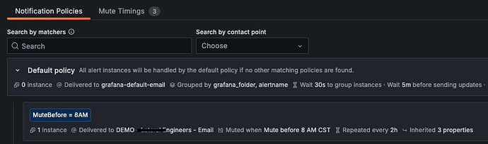 I have set up Notification Policies, that use Mute timings and then routed the alert to notify via the notification policy. The routing works, since I clicked Preview and the routing confirms it uses my policy.