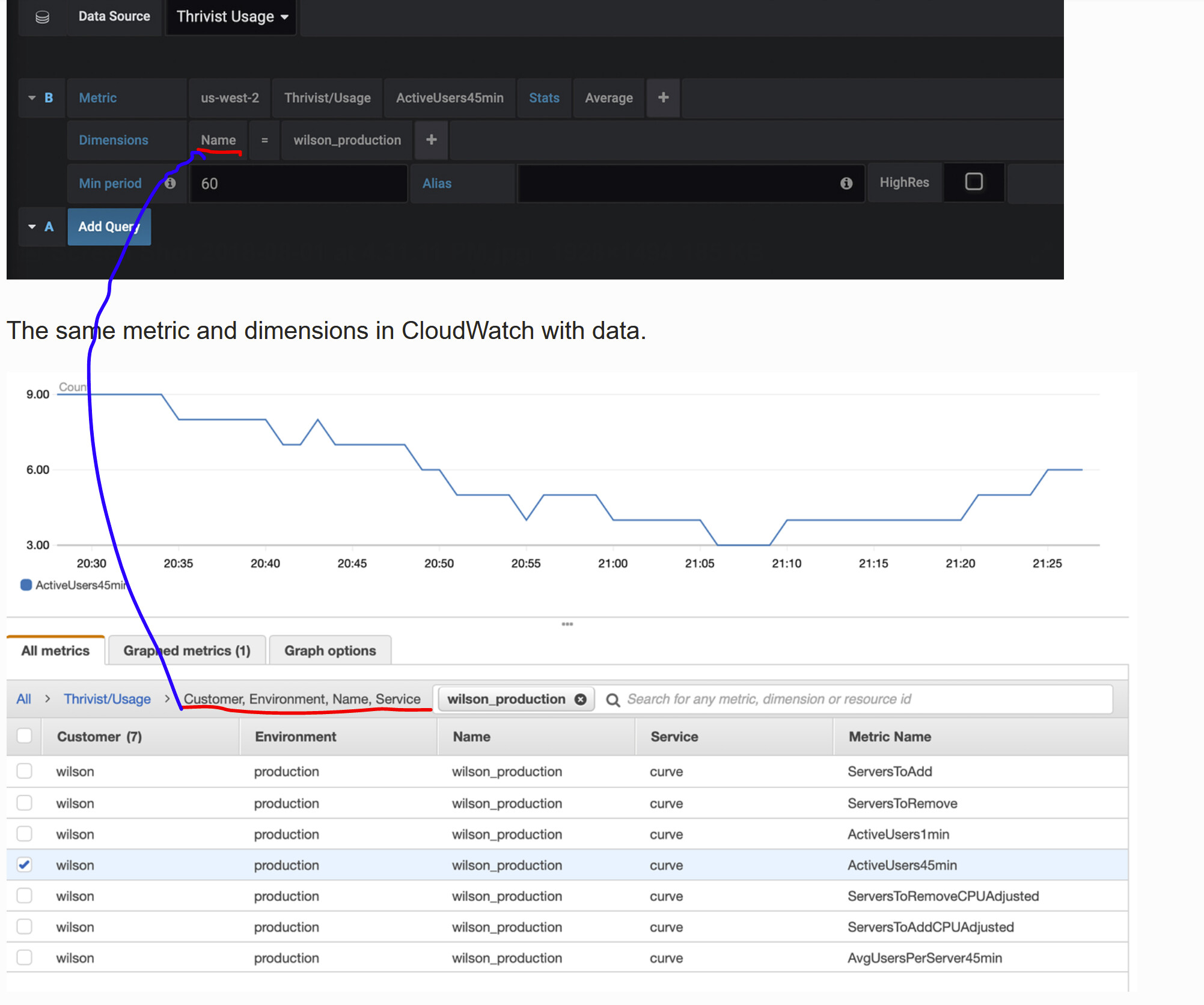 The best option will be if you can show your metric in the aws cloudwatch console. That one shows exactly metric name and dimensions, so it will be easy to compare them with the Grafana query.