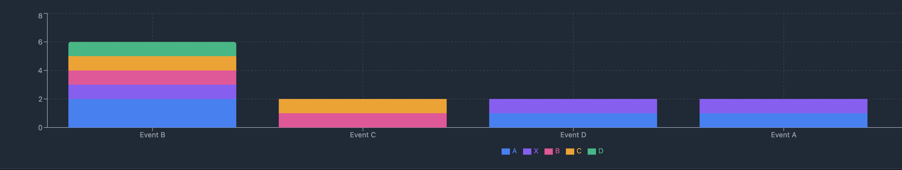So I should end up with a stacked bar chart where each bar represent the event name, the total of the bar represent the total amount of instances among the products used in that event and inside each bar each color would represent a product