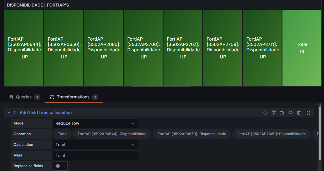I’m trying to sum the number of managed devices on the Fortigate. For example, there are items created in Zabbix for 10 APs managed by the firewall. I need to sum the number of devices and ebiri on the dashboard.